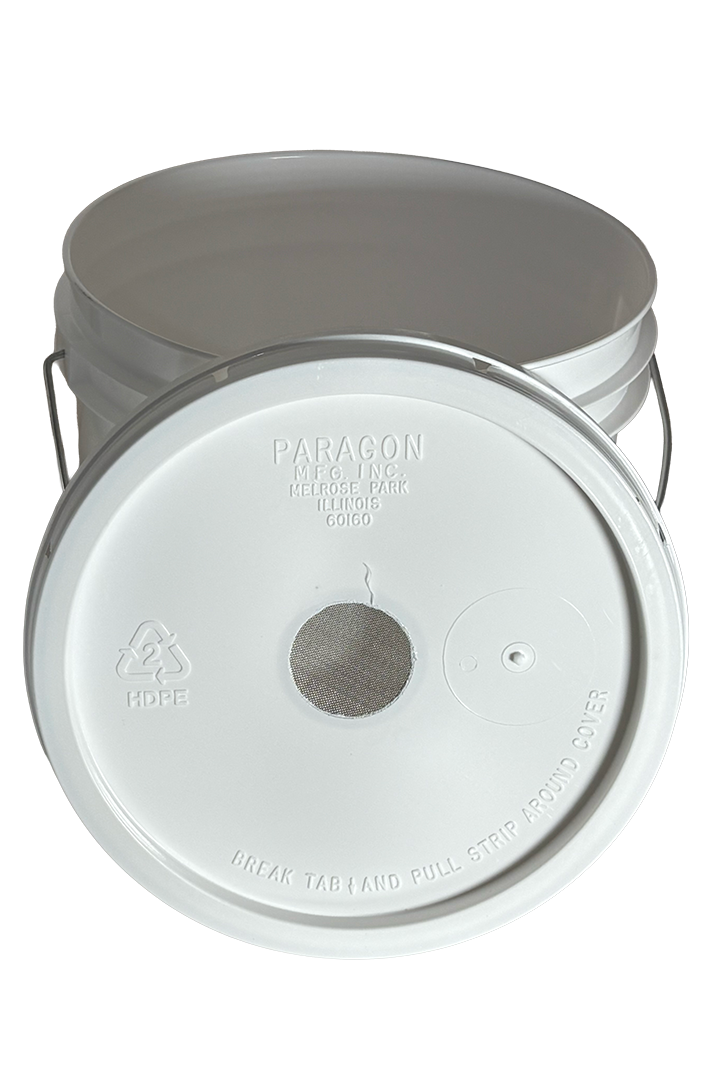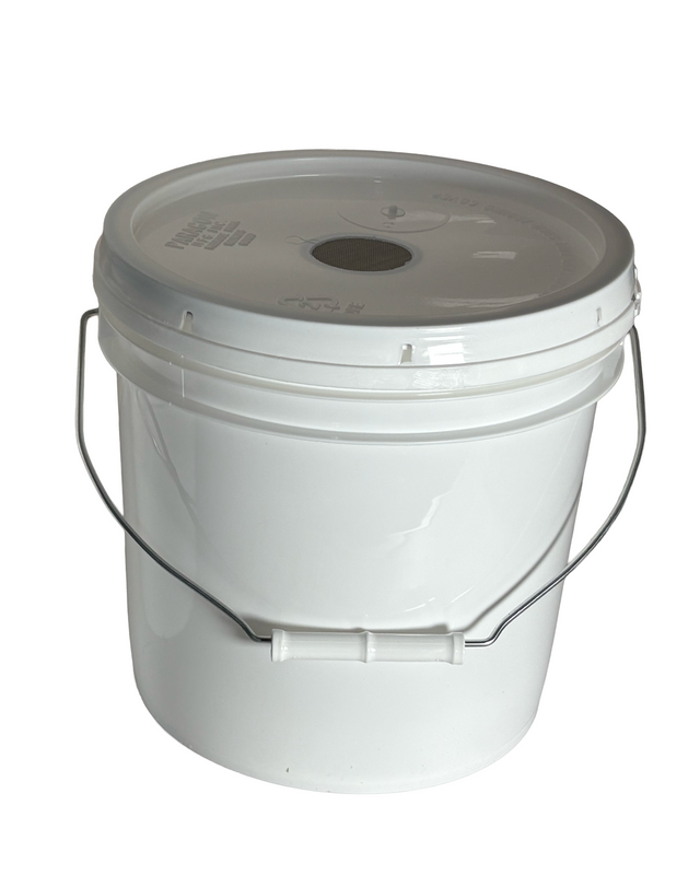 The Bug Farmer™ two gallon bucket feeder is an effective way to get a lot of food on to a hive in a hurry. With its nearly ~2" hole covered with micro woven stainless steel it outperforms bucket feeders made with simple bung plugs. Where a bung plug has several pin hols drilled in it to provide for an area for the bees to feed the Bug Farmer™ bucket feeder with its nearly 2" micro screen allows for more bees to siamotainously gather the syrup from the ~2" surface area and return it to the comb. This will allow your bees to quickly build up stores in the winter with 2:1 syrup or burn through 1:1 in the spring to build out the brood nest or build out comb.