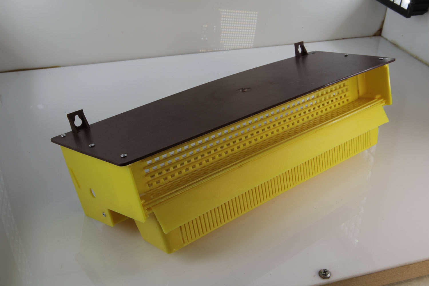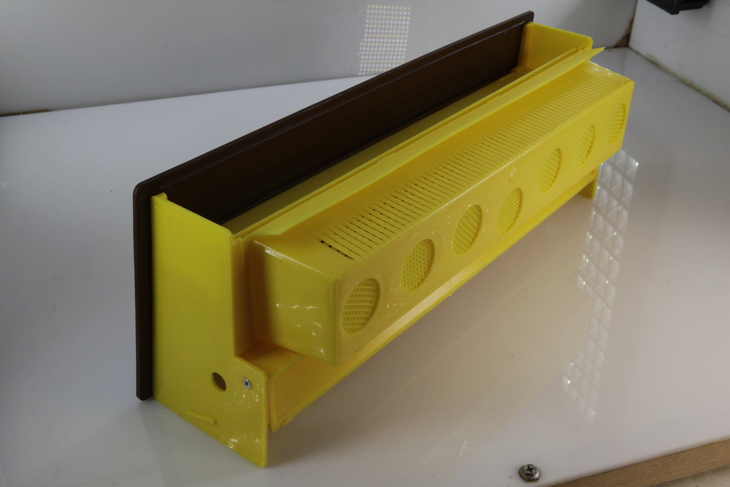 Design: The external mount design allows for easy installation on the front of your hive. It features a robust structure with a brown cover and a bright yellow body, which not only adds visibility but also durability.